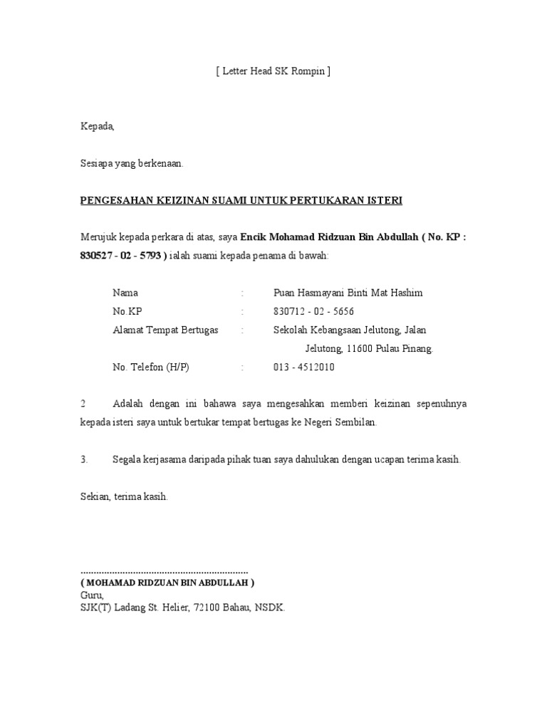 Contoh Surat Izin Suami Eg Tukar